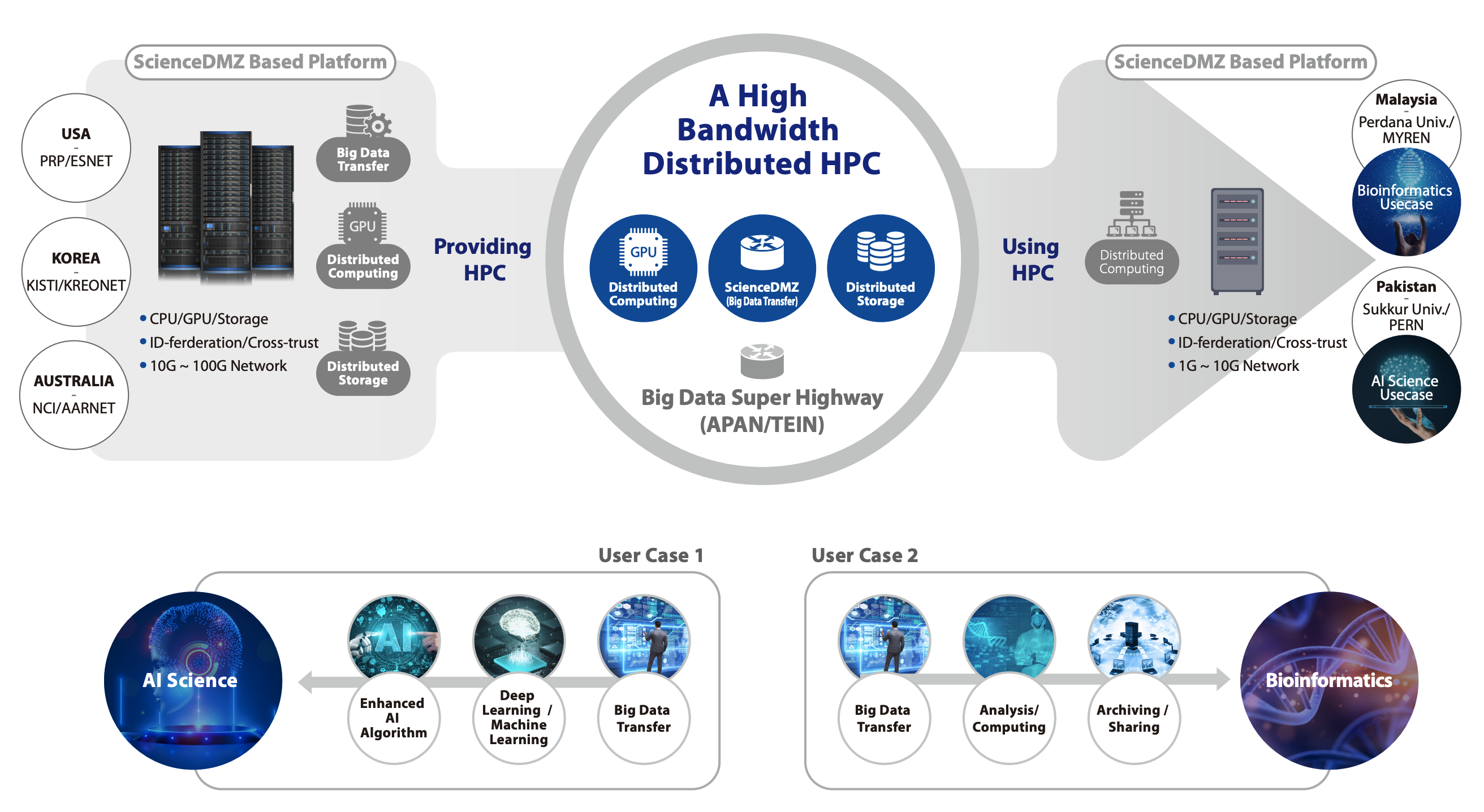 - 분산 고성능 컴퓨팅 자원을 아시아 과학기술인프라 취약국에 제공 -한국과학기술정보연구원(원장 김재수, 이하 KISTI)은 분산 고성능 컴퓨팅 자원의 아시아 개발도상국 원격 제공 사업인 아시아 커넥트(Asi@Connect/TEIN*CC)의 주관기관으로 선정되어, 호주, 말레이시아, 파키스탄과 함께 국제연구망 슈퍼하이웨이 구축사업을 추진한다고 밝혔다.아시아 커넥트 사업은 아시아와 유럽을 초고속 연구․교육망(Trans Eurasia Information Network, TEIN)으로 연결하여 양 대륙 간 국제연구망을 활용한 연구협력을 촉진하는 대표적인 아시아-유럽 간 다자협력사업이다. 2016년부터는 아시아 커넥트(Asi@Connect)라는 신규 사업명으로 추진되고 있다.본 사업은 원격의료, 원격교육, 에듀롬(Eduroam)*, 기후·재난관리 연구 등 대용량의 과학기술 데이터를 빠르게 전송하는 네트워크 인프라를 관리·지원하는 한편, 아시아를 비롯한 개발도상국의 연구망 구축을 지원하고 지역 간 정보격차를 해소하는 사업을 수행하고 있다. 동 사업은 유럽연합(EU) 중심의 재원과 회원국의 분담금으로 운영된다.* 에듀롬(Eduroam, Education Roaming): 고등교육의 연구와 교육을 위한 글로벌 와이파이 로밍 서비스이번 사업은 한국․호주․말레이시아․파키스탄 등 아시아 4개국을 대상으로 KISTI에서 개발․운영 중인 ScienceDMZ* 기반의 한국형 연구플랫폼(Korea Research Platform)을 통해 대륙 간 빅데이터 초고속 전송 기술을 적용하고 이를 기반으로 분산된 컴퓨팅 자원을 연계하여 고성능 계산 환경을 아시아 지역의 개발도상국에 제공하여 고성능 컴퓨팅 기반의 응용연구를 수행한다. 향후 KISTI의 국가 슈퍼컴퓨터 5호기 누리온의 자원도 연계․활용 할 예정이다.* ScienceDMZ: 빅데이터 초고속 전송을 위한 네트워킹 기술로서, 과학기술정보통신부 연구개발 100선 선정(2020년)아시아 커넥트 사업의 수혜국으로 지정된 말레이시아와 파키스탄은 바이오 연구와 인공지능 연구에 필요한 데이터와 고성능 컴퓨팅 자원들을 본 사업에서 구축되는 초고속 전송 인프라 및 고성능 분산 컴퓨팅 플랫폼을 통하여 제공받게 될 것이라고 밝혔다.KISTI는 아시아 국가들과의 초고속 네트워킹 기술 공동연구를 위하여 아시아․태평양 연구 플랫폼을 연구하는 APRP 워킹그룹*을 주도하여 왔다. 이번에 선정된 사업을 통하여 기존 연구 수준을 실제 4개국을 대상으로 적용함으로써 실현 단계까지 연구 수준을 향상시키며 또한 한국 과학기술연구망의 세계적 위상을 제고하는 역할을 수행하게 될 것이다.* APRP(Asia-Pacific Research Platform) 워킹그룹: 초고속 네트워크 기반의 고성능 플랫폼 기술 협력을 위한 아시아 국가 중심의 비영리 연구 협력체APRP 워킹그룹 의장인 KISTI 문정훈 책임연구원은 “이번 사업은 초고속 네트워킹과 분산 컴퓨팅 기술을 융합하여 아시아 개발도상국에 부족한 고성능 컴퓨팅 자원을 제공함과 동시에 기술협력을 도모함으로써 한국의 아시아 IT 리더십도 제고하는 역할을 수행하게 될 것이다”라고 하였다.※ 아시아 커넥트(Asi@Connect/TEIN*CC) 사업은 아시아 지역 빅데이터 고속도로 체계인 ScienceDMZ 구축을 통한 고대역 분산 고성능 컴퓨팅 환경을 제공하는 과제로서 아시아 지역의 부족한 IT 자원과 인프라 체계를 고도화하고 응용연구를 발굴하여 국제경쟁력 향상을 위한 선도 역할을 수행한다.